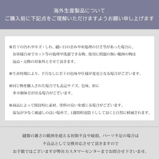 ■注意事項1:商品の開封時に素材の臭いを感じる場合がございます。湿気が少なく風通しの良い場所で、一週間程度陰干しして頂くと自然に軽減されます。