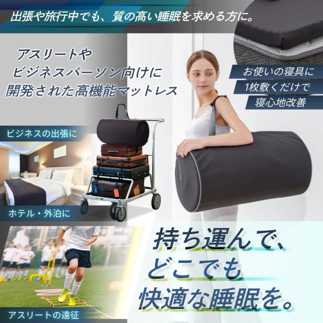 出張や旅行中はもちろん、自宅で来客時にも活躍する「持ち運び可能な高品質マットレス」。専用の収納バック付きでどこでも手軽に上質な眠りを体感できます。忙しい現代人に向けとしても最適。毎日の睡眠環境を整えます。