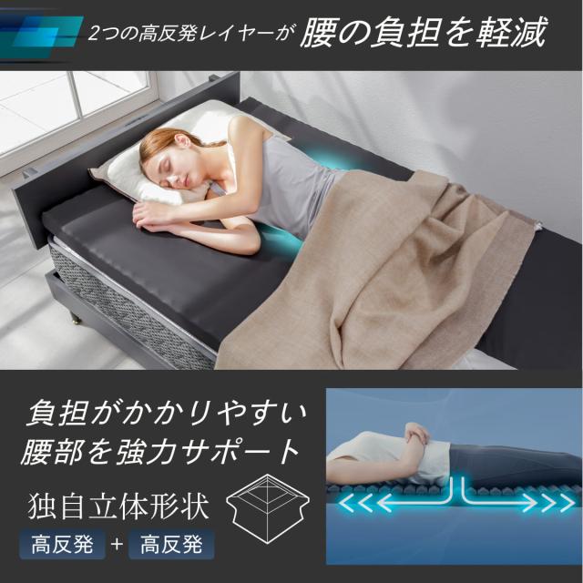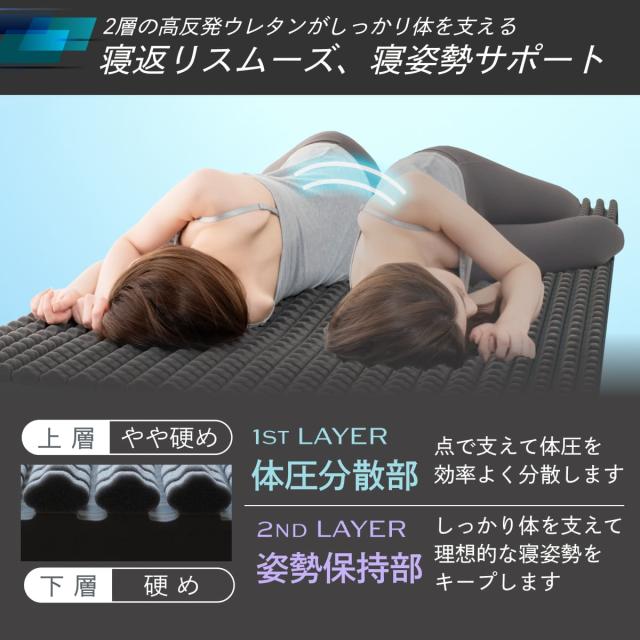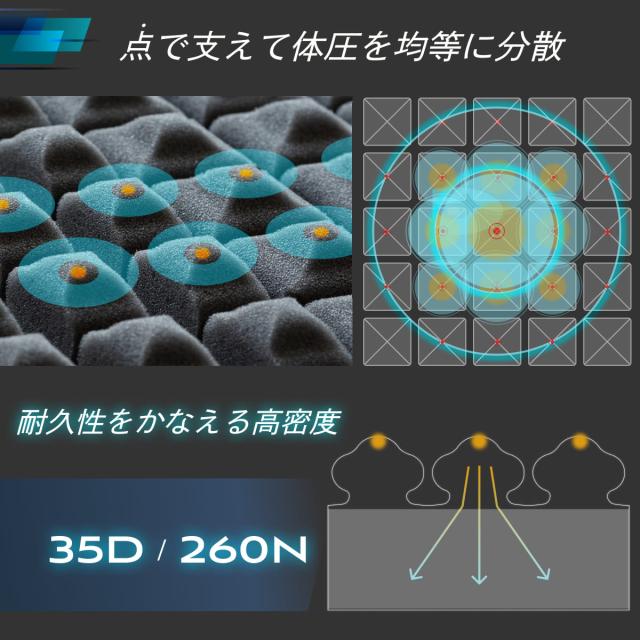 35D260Nの高反発素材で長く使える耐久性。前後左右に動く独自の立体的なセルが、身体の曲線や負荷に合わせて微細な角度でフィットします。高反発のベース部分がしっかり支え、寝返りが楽になる体圧分散設計です。