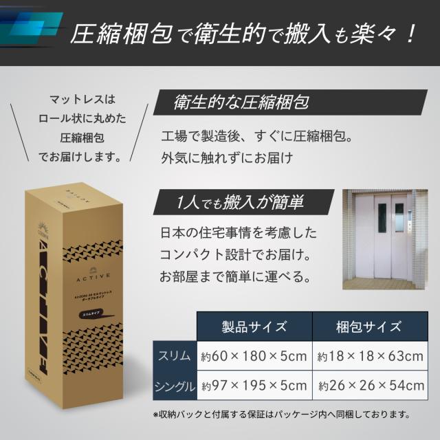 | サイズ・重量 | ・製品サイズ:約97cm×195cm×5? ・製品重量:マットレス重量:製品重量 : 約3.2kg ・梱包サイズ:"約26×26×54cm " |