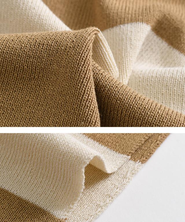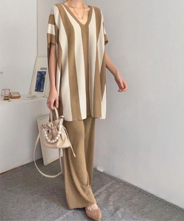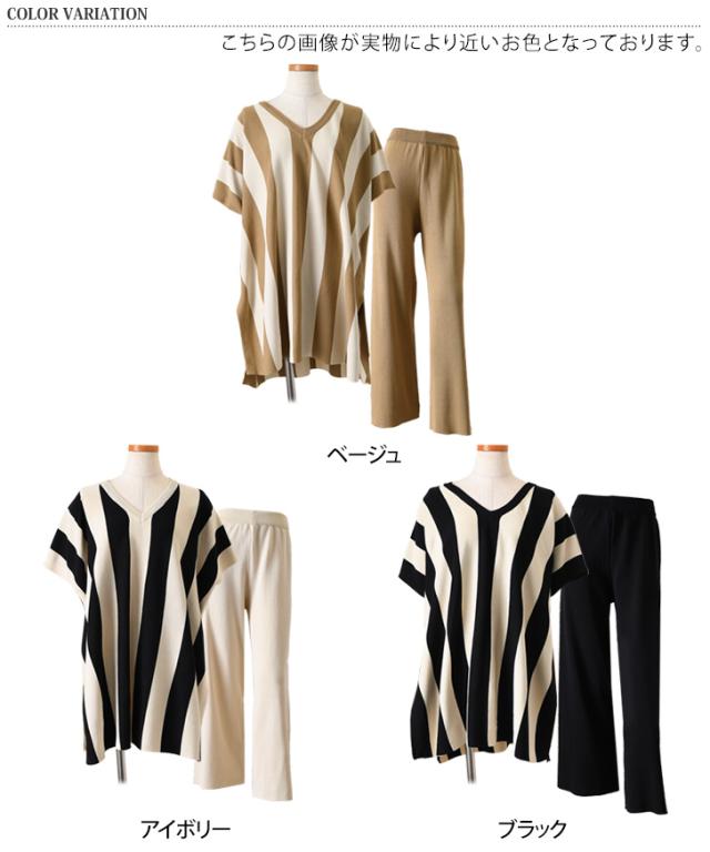 新作 太ストライプビッグドルマンニットソー×ワイドパンツセットアップ レディース ライトニット カットソー 半袖 トップス ボトムス 上下 春夏 薄手 大きいサイズ 大きめ ゆったり Vネック ウエストゴム おしゃれ