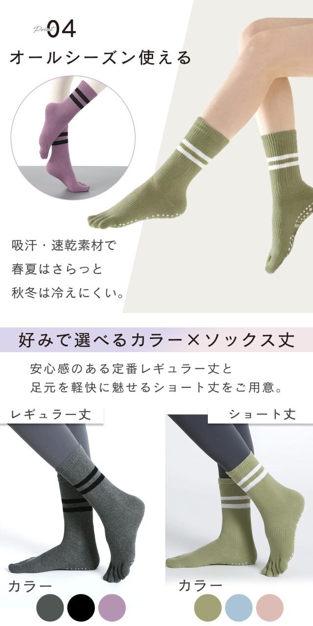 ヨガやピラティス、ストレッチなど動きの多いシーンで、しっかりと足元を支える滑り止め付きの五本指ヨガソックス。