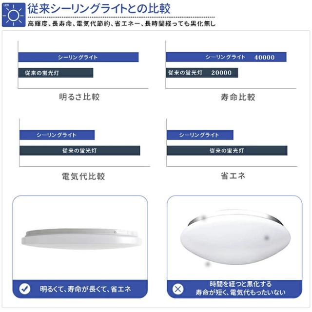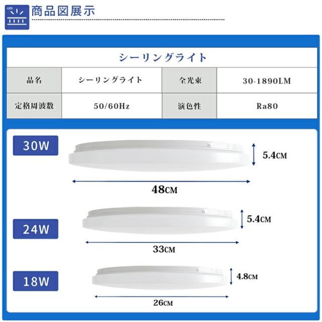 LEDシーリング ライト定格電圧:AC100V ; 定格周波数:50/60Hz ; 消費電力:0.3-24W ; 演色性:Ra80; 明るさ:30-2310LM ; サイズ : 33×5.4cm ; 色温度:3000K-6500K ; 重さ:572g;設計寿命:40000時間。