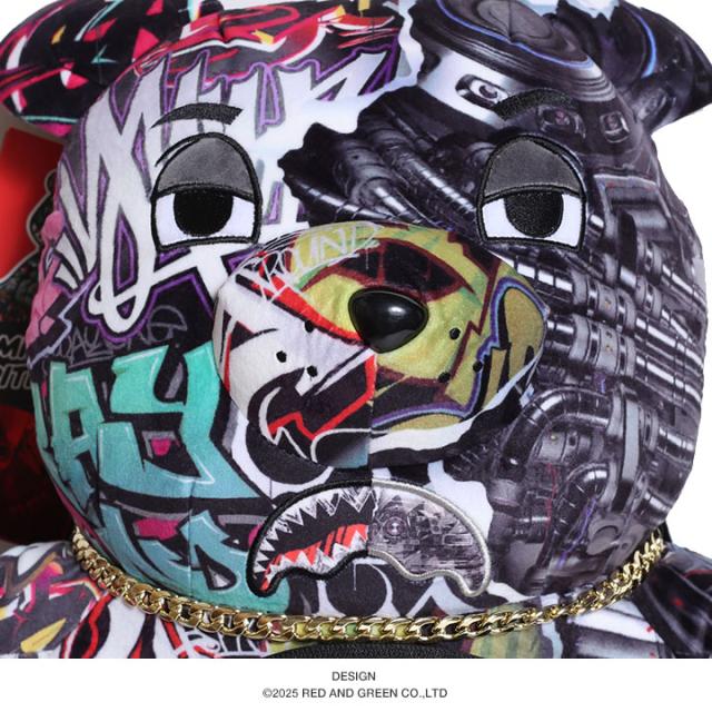 ストリートカルチャーを代表する「スプレーアートグラフィティ」(ブランドロゴを反復させたモノグラムの総柄)と、サイバーパンク(メカの配線を描いたグラフィック)をアシンメトリーで表現した総柄デザイン。口元にはブランドアイコンの「シャークマウス/サメの口」を刺繍で配置しています。