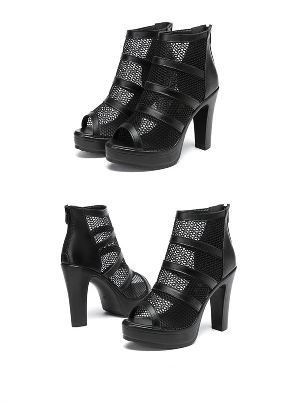 ブーツサンダル サンダル レディース メッシュ オープントゥ サマーブーツ ショートブーツ 夏 ハイヒール ピンヒール 美脚 大きいサイズ かっこいい 可愛い おしゃれ シースルー 透け感 後ろファスナー バックジップ 通気性 ブラック