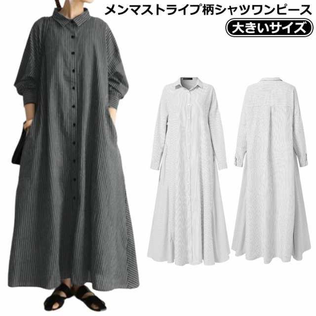 シャツワンピース きれいめ ロング シャツワンピ 長袖 ロングシャツ ロングワンピース 2way ワンピース ロング丈 綿麻ワンピース ストライプ柄 Aライン ワンピース ロング丈 大きいサイズ マキシワンピース マキシ丈 綿麻混 ゆったり 体型カバー カジュアル おしゃれ 白 黒