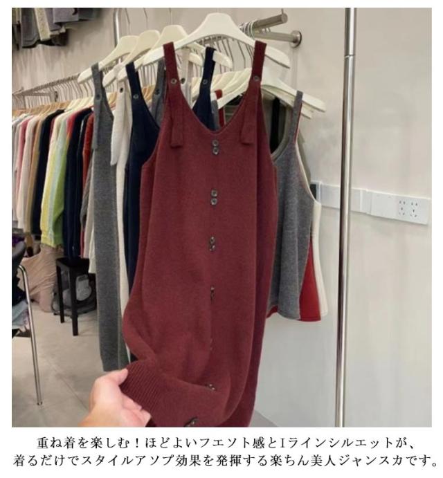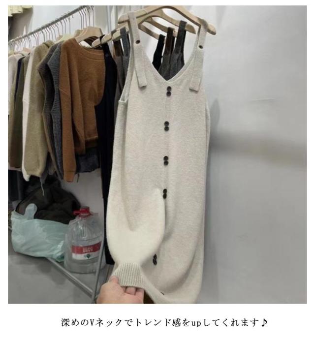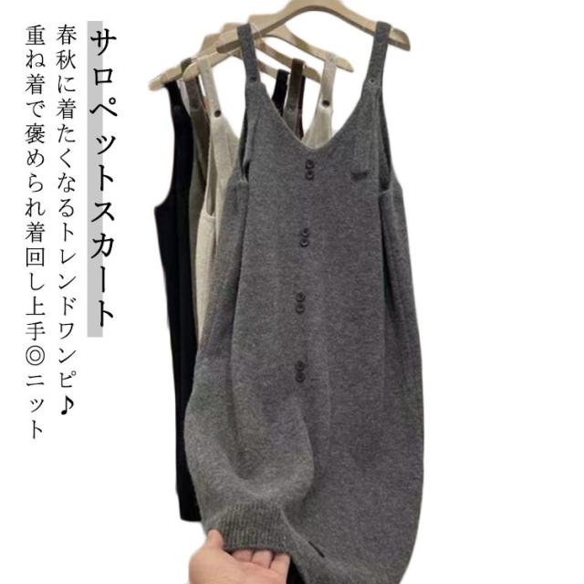 ボタン飾り ニット サロペットスカート レディース ジャンパースカート サロペットスカート ワンピース Vネック カジュアル ワンピ ジャンスカ オールインワン 重ね着 ノースリーブ 大人 かわいい 無地 タンクワンピース ゆったり 体型カバー マタニティ 春 秋 冬
