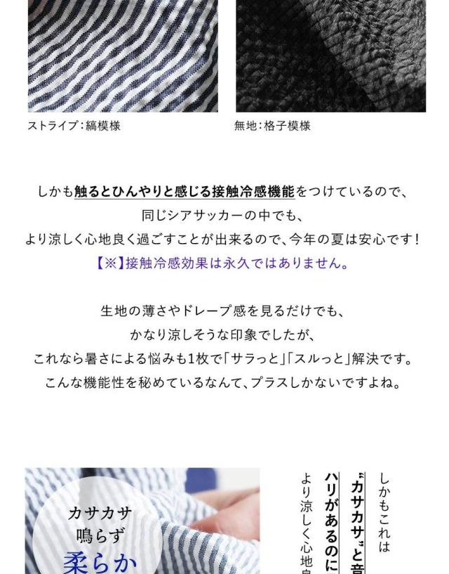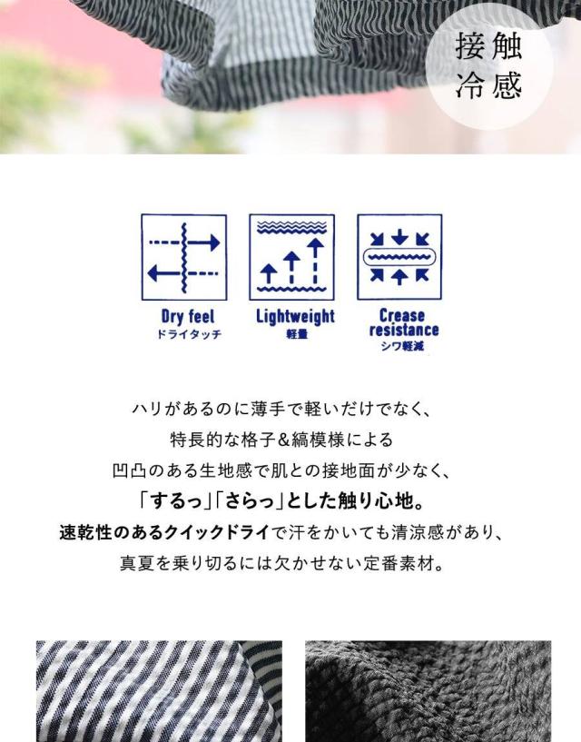 ・薄手で軽く、格子&縞模様による凹凸感で肌との接地面が少ないシアサッカー。