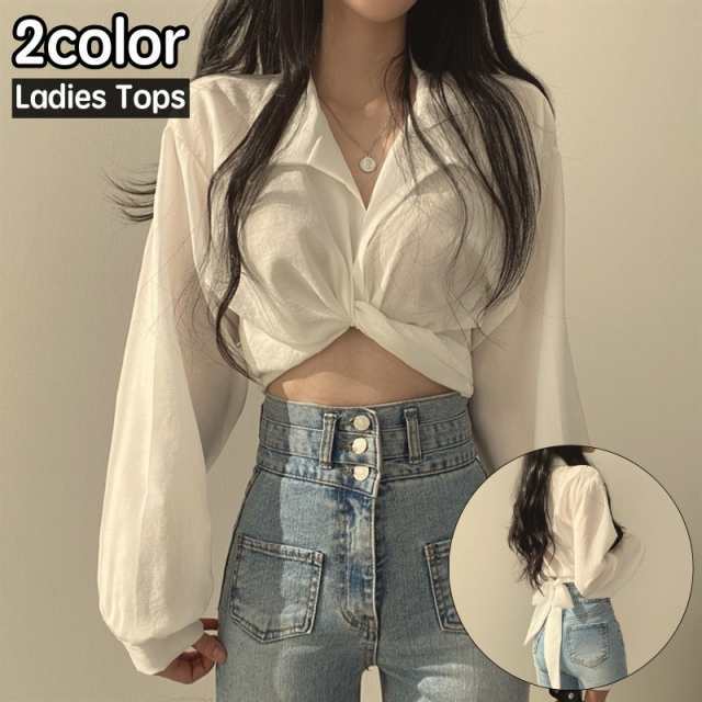 ブラウス 長袖 レディース 女性 トップス ショート丈 バックリボン 裾クロス フロントクロス ヘソ出し プルオーバー 無地 上