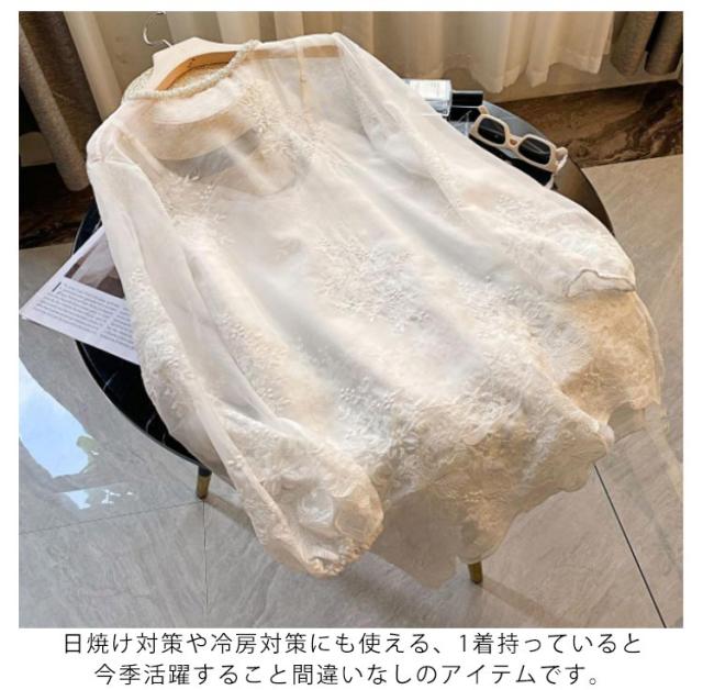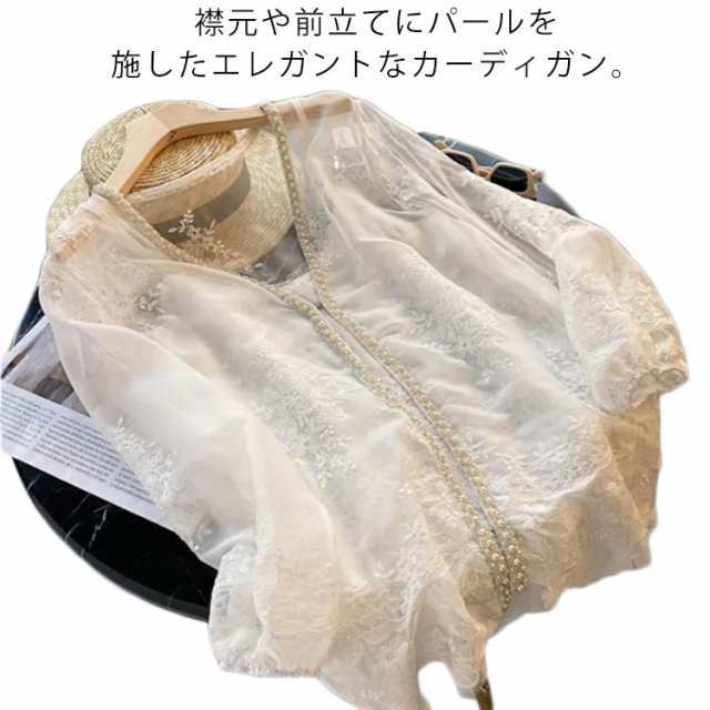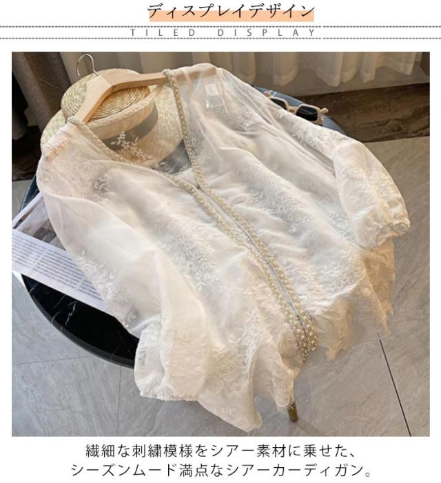 シアーカーディガン シアートップス 長袖 レディース シースルー 透け感 サマーカーディガン パール 刺繍 トップス 紫外線対策 UVケア 冷房対策 薄い 薄手 涼しい ライトアウター 羽織り ゆったり レイヤード 大人 上品 エレガント カジュアル オフィス 春 夏