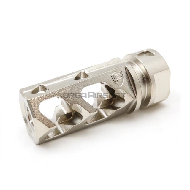 FORTIS Muzzle Brake 5.56 SS を再現した14mm逆ネジ対応のフラッシュハイダーです。SSは実物ではステンレススチール素材モデルとなりますが、本製品ではブラスト処理とメッキコーティングによりステンレスシルバーの輝きを再現しています。