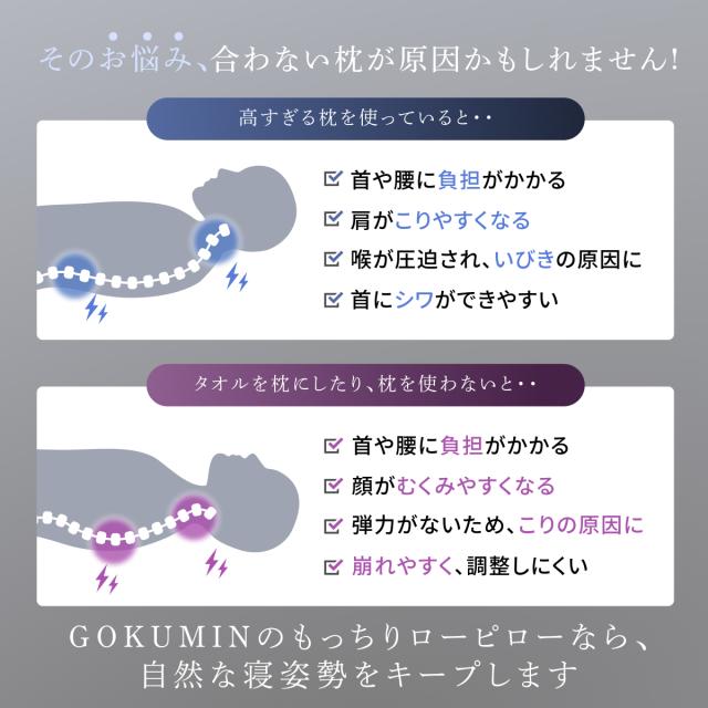 GOKUMIN もっちりローピロー 低め枕 低反発 【首と肩にやさしいもっちもち低反発枕】もちもち 柔らかめ 替えカバー付き 洗えるカバー 収納袋付き ゴクミン 枕 まくら 低め 洗える 首が痛くならない 抗菌防臭