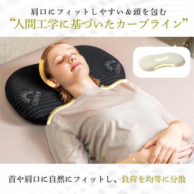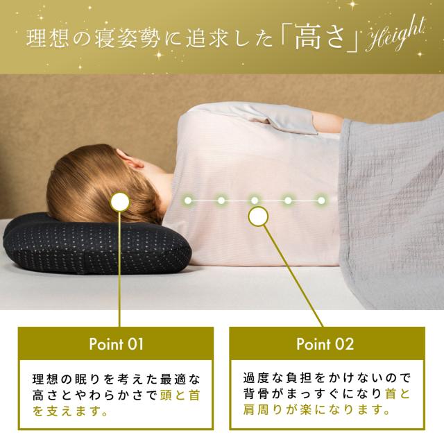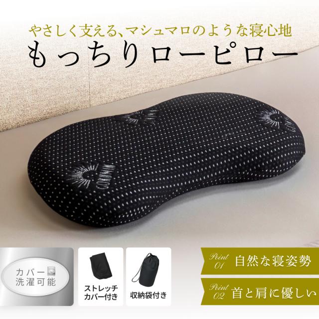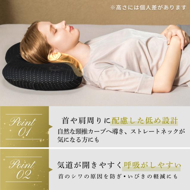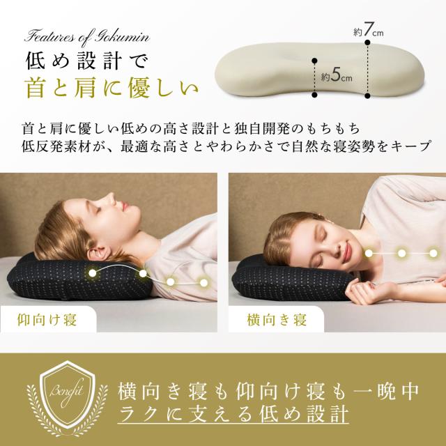 首と肩に優しい低めの設計と、独自のもちもち低反発素材が、最適な高さとやわらかさで首と肩を優しくサポート。低すぎない高さ設計で、あらゆる寝姿勢でも一晩中ラクに支えます。