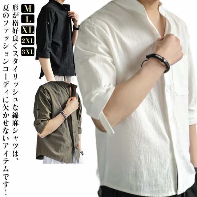 夏 綿麻風 七分袖 シンプル スリム 無地 カジュアルシャツ シャツ 薄手 立ち襟 ワイシャツ おしゃれ 半袖 速乾 リネンシャツ 春服 メンズ 涼しい 通気 軽い 快適 薄手 カジュアル ビジネス おしゃれ 無地 春夏 窮屈感ゼロ 夏服