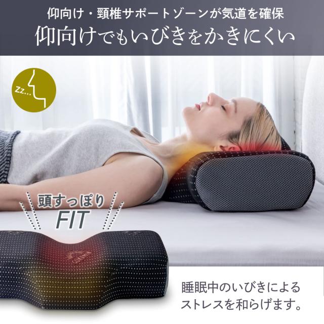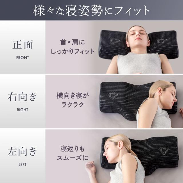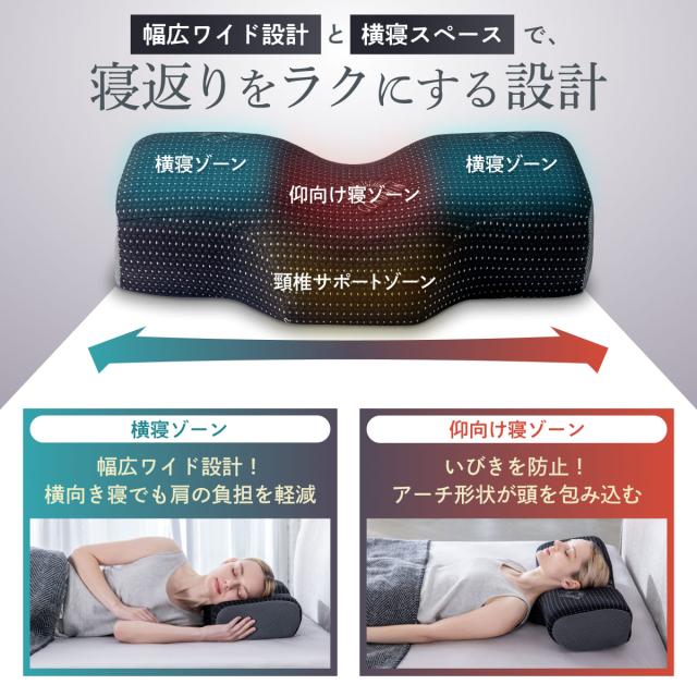 【寝返りラクラク!幅広設計と独自ゾーニングで快適サポート】横向き寝ゾーンが肩や首への負担を軽減し、仰向け寝ゾーンのアーチ形状でいびきを防止。頸椎サポートゾーンが理想の寝姿勢を保ち、寝返りもスムーズに。寝返りが多い方や、起きた時に肩や首に負担を感じている方にもぴったりの設計です。