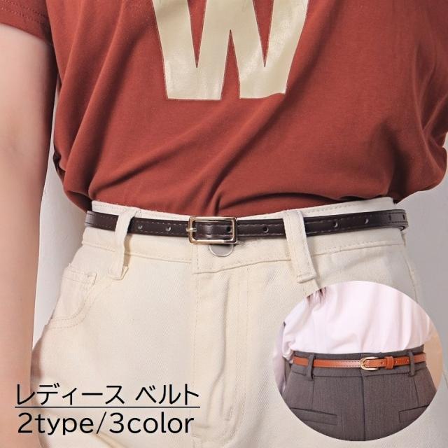 ベルト レディース 女性 婦人 細ベルト 細め レザー調 フェイクレザー 穴あき ラウンド スクエア 調節可能 ウエストマーク