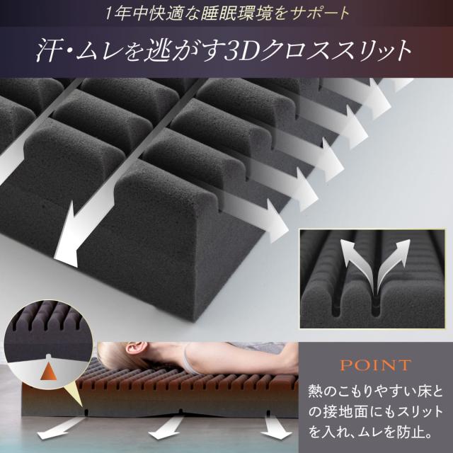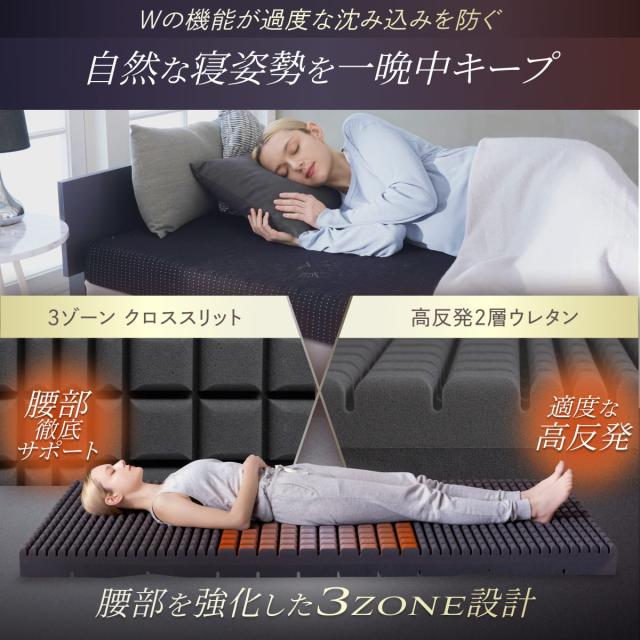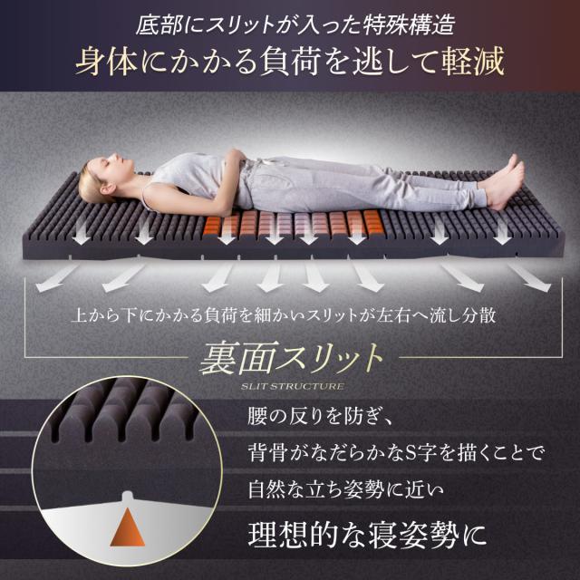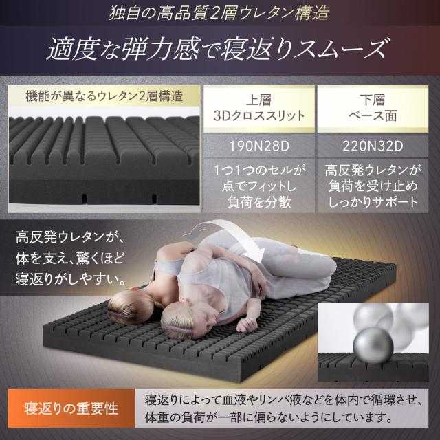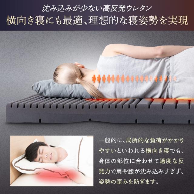 上層のクロススリット面が点でフィットし、下層のベース面が上からの負荷を受け止めてサポート。2種類の高反発ウレタンが体をしっかり支え、睡眠の質を向上をサポート。