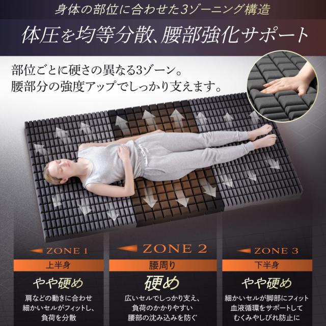 特殊3D立体クロススリットによる3ゾーニング構造が体の部位に合わせて体圧を均等に分散。特に腰部は広いセルでしっかり支え、腰に不安のある方にもおすすめです。