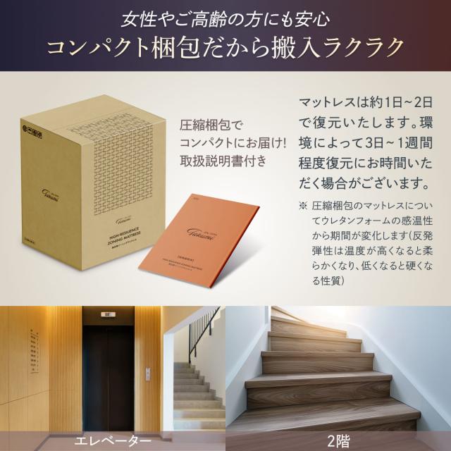 | サイズ・重量 | ・製品サイズ:幅97cm×奥行195cm×厚み10cm ・製品重量:マットレス重量:約6.3kg ・梱包サイズ:約37×37×54cm |