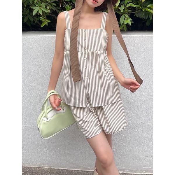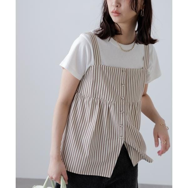 さらっとして肌に張り付かない素材感のキャミソール。異ピッチのシャツストライプが爽やかな印象で、共地のクルミ釦がアクセント。胸下切り替えを入れ、前裾はスリットデザインがポイント。バックスタイルはカットアウトデザインで抜け感をプラスしています。パジャマ感のあるアイテムを街で着るのが今年らしいスタイリングを後押し。同素材のストライプショートパンツ(店舗商品番号131−5230051)を合わせ、リラックス感あふれるヘルシーな着こなしがおすすめです!※モデルの着用画像の場合、光の当たり具合により、実際の色味と異なって見えることがございます。色味は、商品単体の画像をご参照ください。