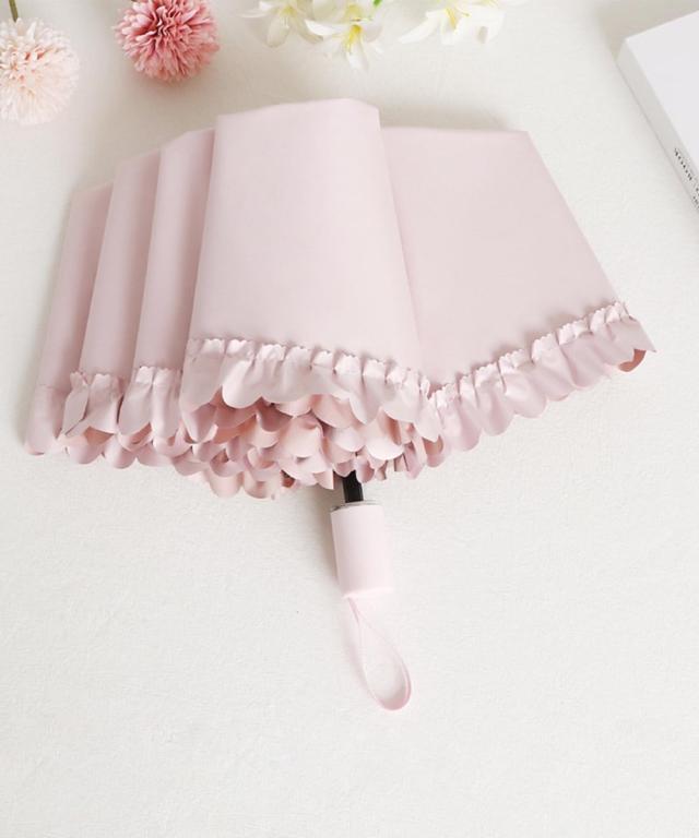 甘さと実用性を兼ね備えた、女性らしい印象のフリル付き折りたたみ傘。バッグにすっと収まるサイズ感で、雨の日も晴れの日も気分が上がるアイテムです。