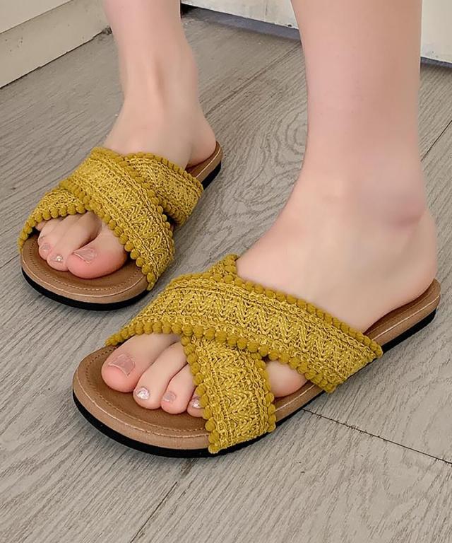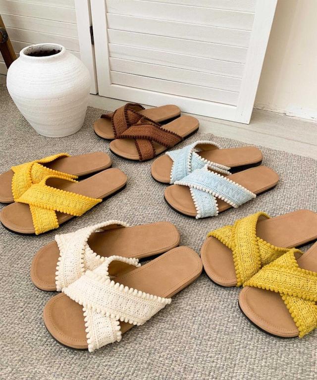 太めのクロスストラップが足にしっかりフィットし、脱ぎ履きも簡単。編み目のディテールが素朴ながらおしゃれな雰囲気を醸し出し、カジュアルスタイルにもフェミニンスタイルにもマッチします。軽やかな履き心地で、歩きやすさも◎。