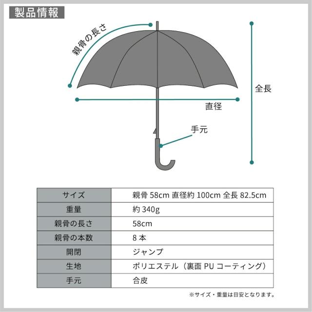 ■素材:生地:ポリエステル、親骨:グラスファイバー、中棒:鉄、手元:合皮、開閉:ジャンプ