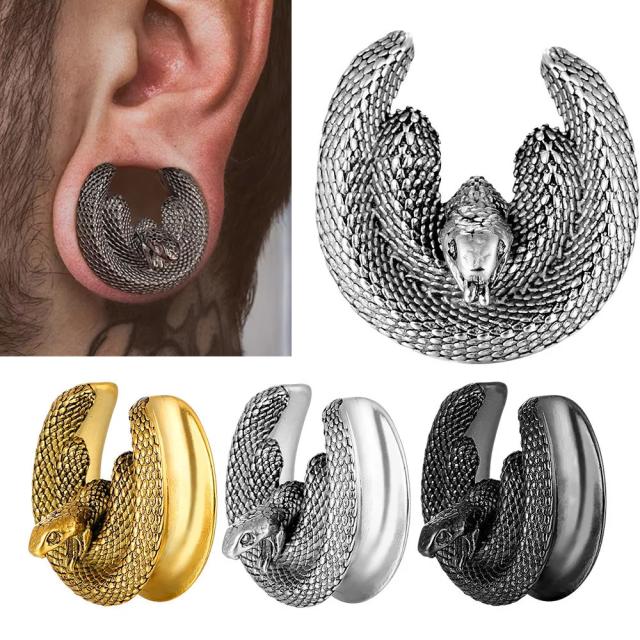 立体的で大きなヘビが蜷局を巻いて威嚇する含みなC型のステンレス製のダブルフレアボディピアス。