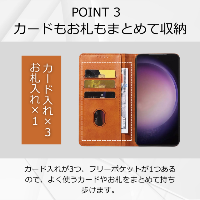 収納:カードポケット×3、紙幣やレシートが入るフリーポケット×1