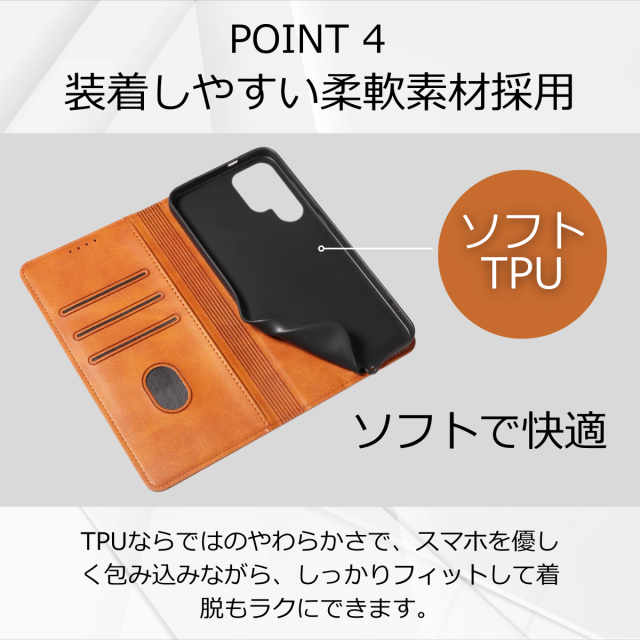 外側は高級感のあるPUレザー、内側は衝撃をやわらげるTPU素材を採用し、大切な端末をしっかり保護します。