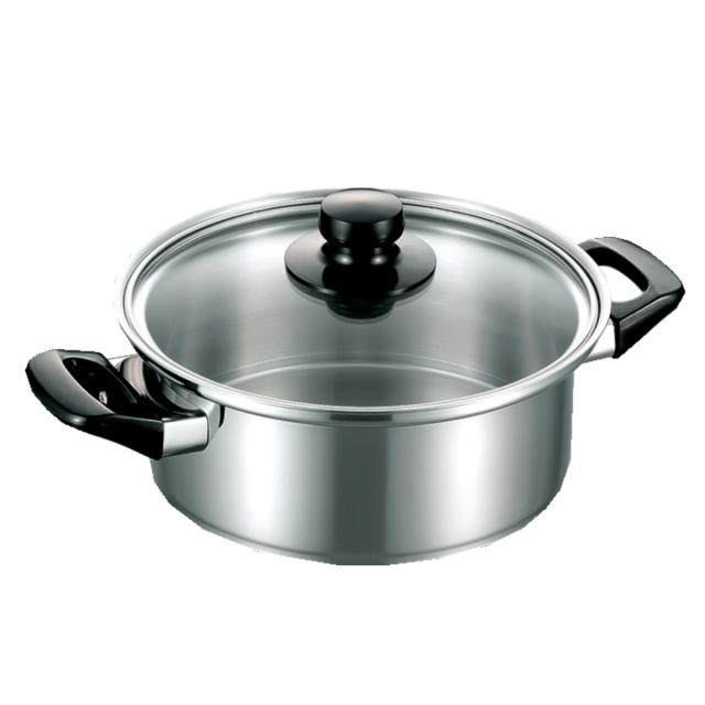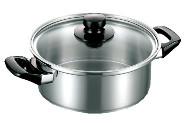 IHやハロゲン、ラジエントなどの電気調理器に合わせて作られた両手鍋です。錆びにくく熱効率に優れた特殊ステンレス「NSSC180」を使用するとともに、鍋の底面のみを厚くする特殊加工が施されているので、熱変形を防ぐことができます。