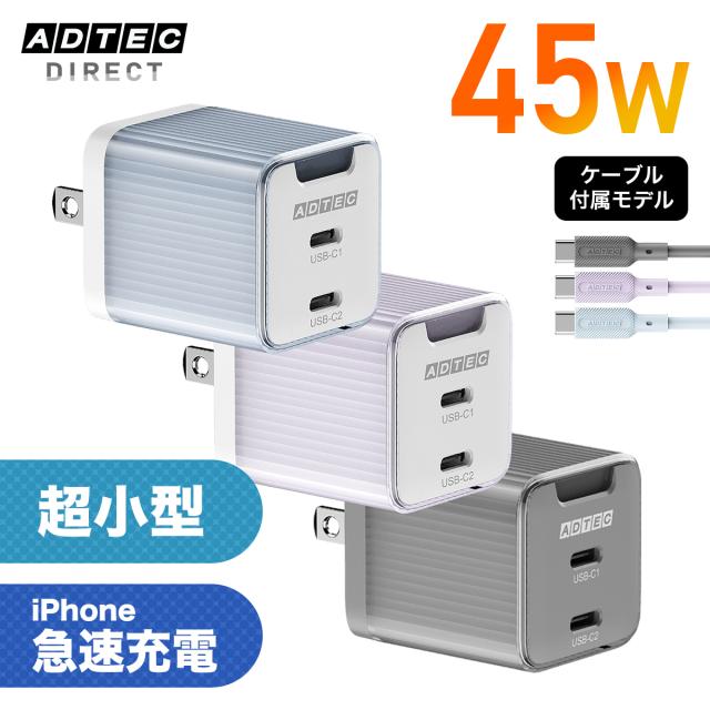 【パステルカラー】45W急速充電 PD充電器 USB-C×2 ケーブル付き 小型 コンパクト iPhone MacBook Air対応 日本メーカー