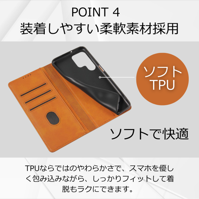 外側は高級感のあるPUレザー、内側は衝撃をやわらげるTPU素材を採用し、大切な端末をしっかり保護します。