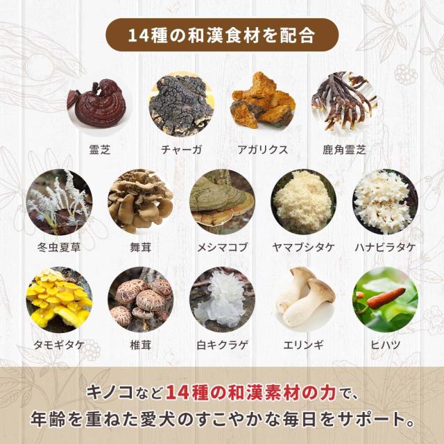 キノコなど14種類の和漢素材の力で、年齢を重ねた愛犬のすこやかな毎日をサポート。