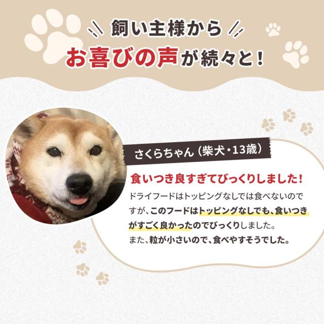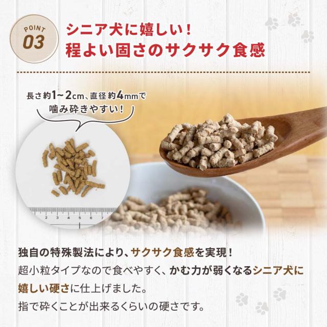 超小粒タイプなので食べやすく、かむ力が弱くなるシニア犬に嬉しい硬さに仕上げました。
