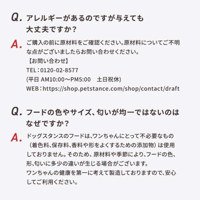 ドッグスタンスのフードは、ワンちゃんにとって不必要なもの(着色料、保存料、香料や形をよくするための添加物)は使用しておりません。そのため、原材料や季節により、フードの色、形、匂いに多少の違いが生じる場合がございます。
