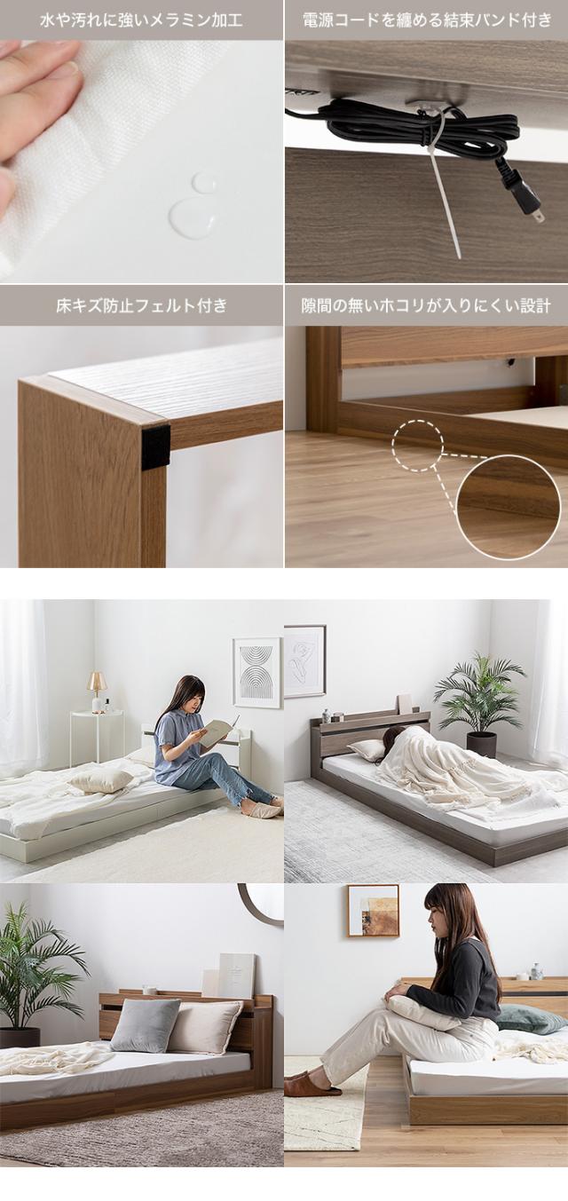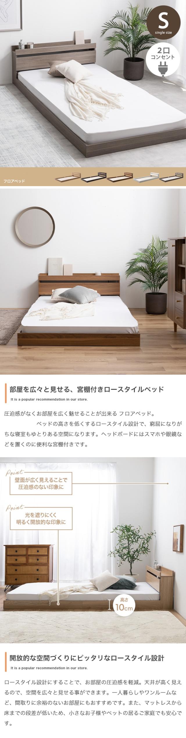 【シングル】【フレームのみ】 ROCOA ベッド コンセント付きベッド ホワイト色他 全5色対応 超ローベッド 本体 幅100cm 奥行210cm 高さ45cm 組み立て式 ※マットは付いておりません。