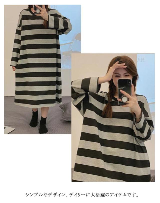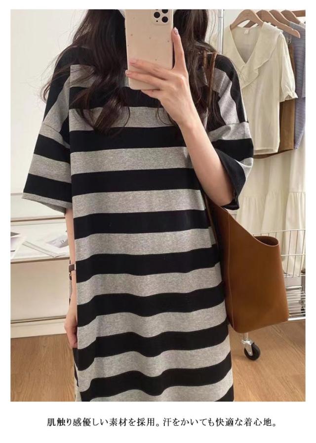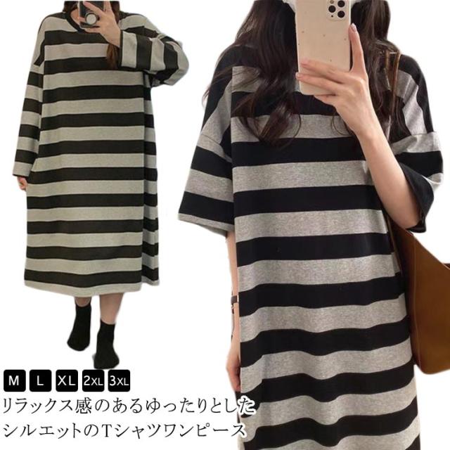 Tシャツワンピ 半袖 レディース ワンピース ロングワンピース tシャツワンピース 夏 部屋着 着痩せ ゆったり 体型カバー カットソー ポケット ボーダー柄 カジュアル おしゃれ 大きいサイズ 通勤 ルームワンピース シンプル 着?せ 送料無料