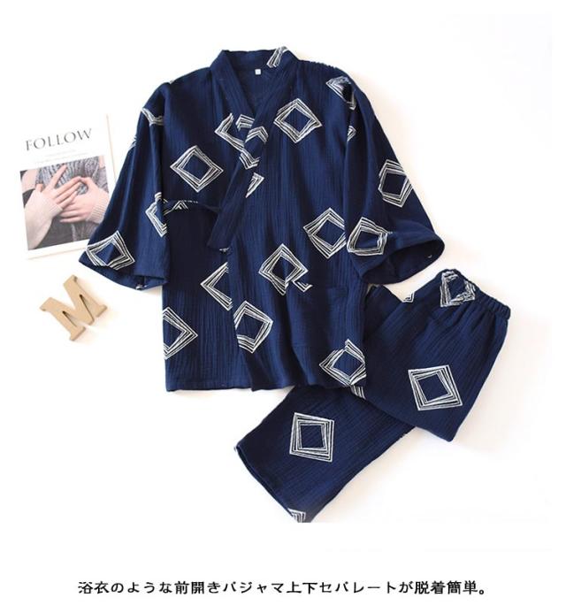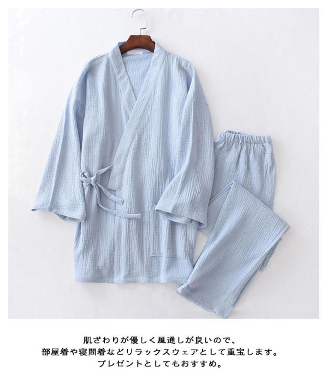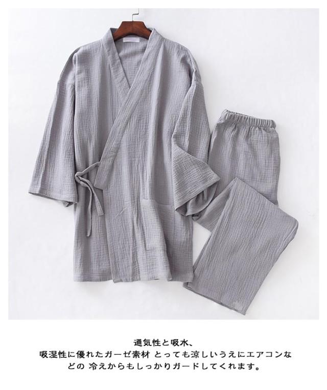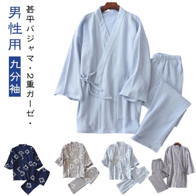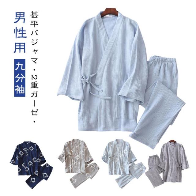 甚平 パジャマ メンズ 甚平ルームウエア ワンマイルウエア 上下セット Vネック 九分袖 長ズボン 春夏秋 通気性 優しい着心地 2重ガーゼ 甚平風寝巻き 普段着 薄手 テレワーク 在宅勤務 夏祭り 花火大会 贈り物 M L XL 送料無料