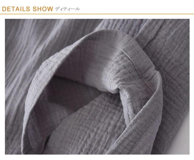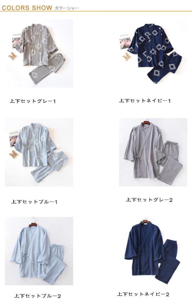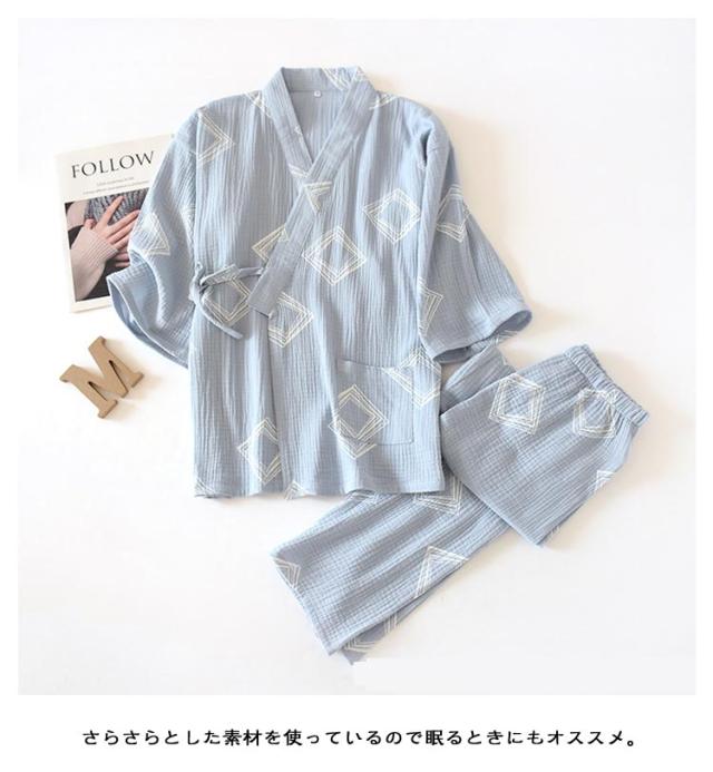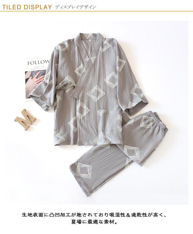| 甚平パジャマ・2重ガーゼ・男性用 生地表面に凸凹加工が施されており吸湿性&速乾性が高く、夏場に最適な素材。 浴衣のような前開きパジャマ上下セパレートが脱着簡単。 さらさらとした素材を使っているので眠るときにもオススメ。 通気性と吸水、吸湿性に優れたガーゼ素材 とっても涼しいうえにエアコンなどの 冷えからもしっかりガードしてくれます。 肌ざわりが優しく風通しが良いので、部屋着や寝間着などリラックスウェアとして重宝します。プレゼントとしてもおすすめ。 | |