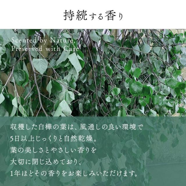 | サウナの余韻を、お部屋にそっと 森の香りをお部屋でも楽しめるように、北海道産の白樺を使った「小さなドライヴィヒタ」をご用意しました。 玄関や洗面所に吊るせば、ふんわりとやさしい香りが広がり、まるで森の中にいるような空気を演出してくれます。 100%道東産の白樺を使用 弟子屈町、清里町、小清水町、大空町。澄んだ空気と静かな森に包まれて育った白樺の葉だけを選びました。 柔らかくて丈夫な葉 おうちの中に、ほんのり森のやさしさを。白樺の葉のサラサラとした手ざわりが心地よく、暮らしにそっと寄り添ってくれます。 持続する香り 収穫した白樺の葉は、風通しの良い環境で5日以上じっくりと自然乾燥。葉の美しさとやさしい香りを大切に閉じ込めており、1年ほどその香りをお楽しみいただけます。 サステナブルな森の恵み 畑に差し込む光を取り戻すために伐られた白樺の木々。その命を無駄にせず、森の香りとして次のかたちへ。 手作りの温もり 自然の香りをそっと包むように、手作業で丁寧に仕上げました。 |
