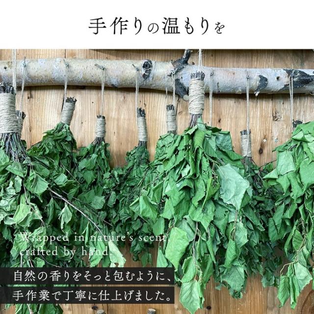 | ・葉っぱに湿気が残っている時は数時間乾かしてからご利用ください。 ・天然の白樺の葉を使用しているため、稀に虫が付着している場合があります。 (乾燥時の虫除けのため、自然由来のミントスプレーをふきかけています) ・葉っぱが落ちていたり、葉の表面が白く変色する場合があります。 ・ご購入後にも葉っぱが落ちることがあります。 ・本商品はウィスキング(体を叩く用途)としての実用性はありません。 ・自然のものですのでかなりの個体差があります。また記載されてある重量やサイズから外れる可能性もあることをご了承ください。 |