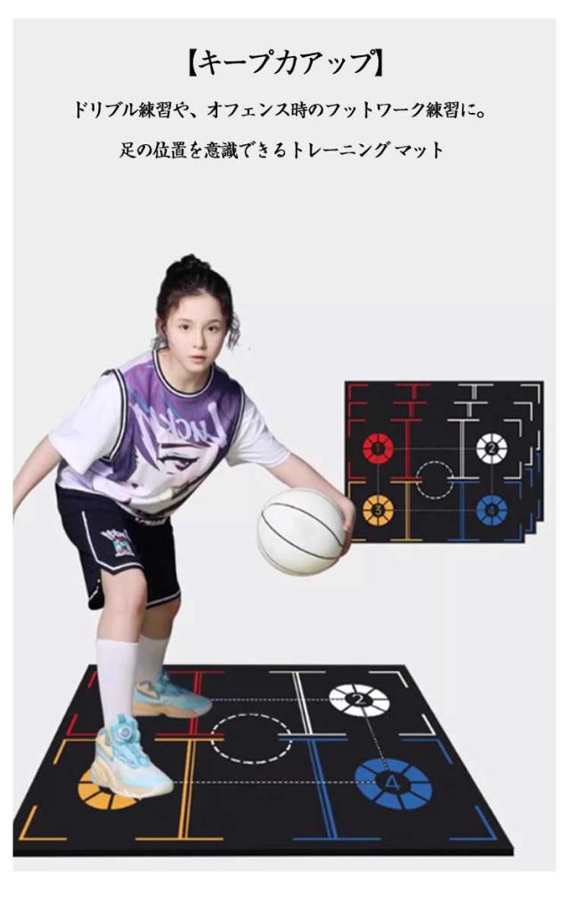 | 【バスケ練習用マット】【子供〜ジュニア〜大人】 【キープ力アップ】ドリブル練習や、オフェンス時のフットワーク練習に。足の位置を意識できるトレーニング マット 【滑り止め付き】マット裏面は、床の上で滑りにくいPVC素材 【お手入れカンタン】表面は汚れたら、さっと水拭きができるバスケットボール用マット 【正しい型を身に着ける】 正しい型を身に着けることが上達の近道 そのために、足の位置を意識できるトレーニング マットが効果的です 足とボールの位置を意識して練習することで、正しい型が身に付きます | |