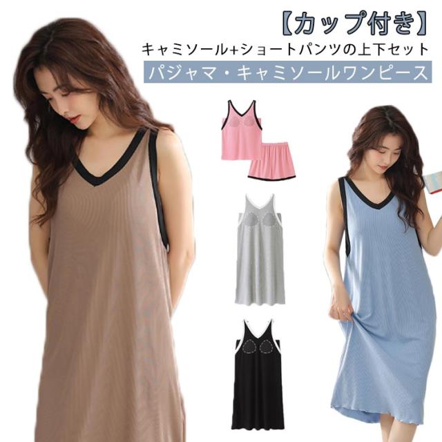 ノースリーブ 夏 キャミソールワンピース キャミソール キャミワンピ 2タイプ レディース ルームワンピース 膝下 カップ付き タンクトップ パジャマ ショートパンツ 上下セット 外出 部屋着 リラックス おしゃれ 20代30代