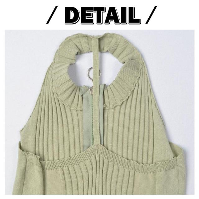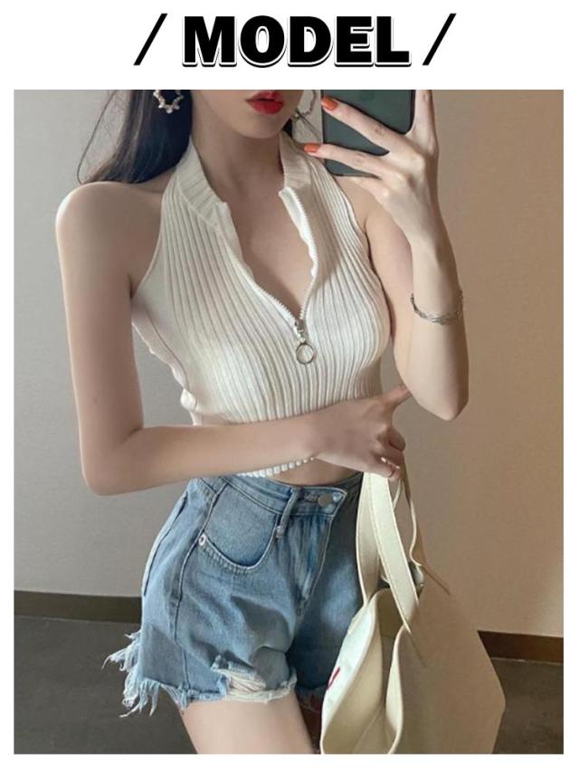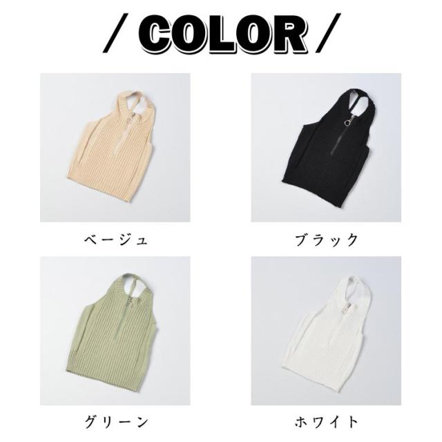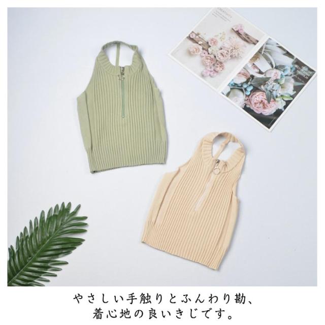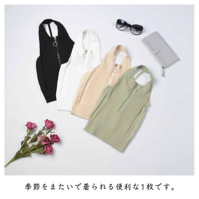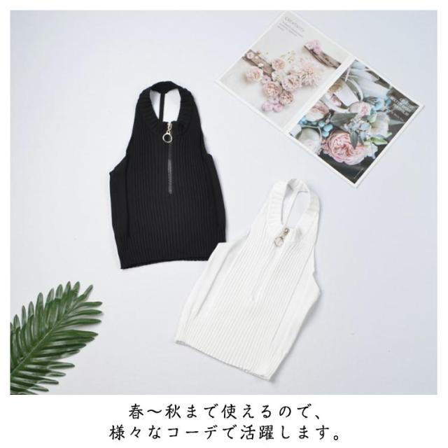 夏 レディース ニット 前ファスナー ホルターネック トップス 春 ホルターネック サマーニット ノースリーブ 肩出し トップス ブラック セクシー 海 旅行 フェミニン 袖なし 上品