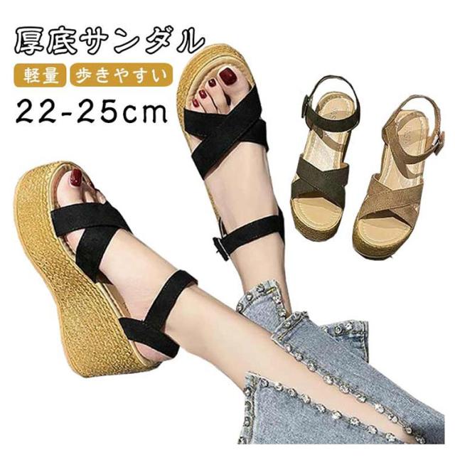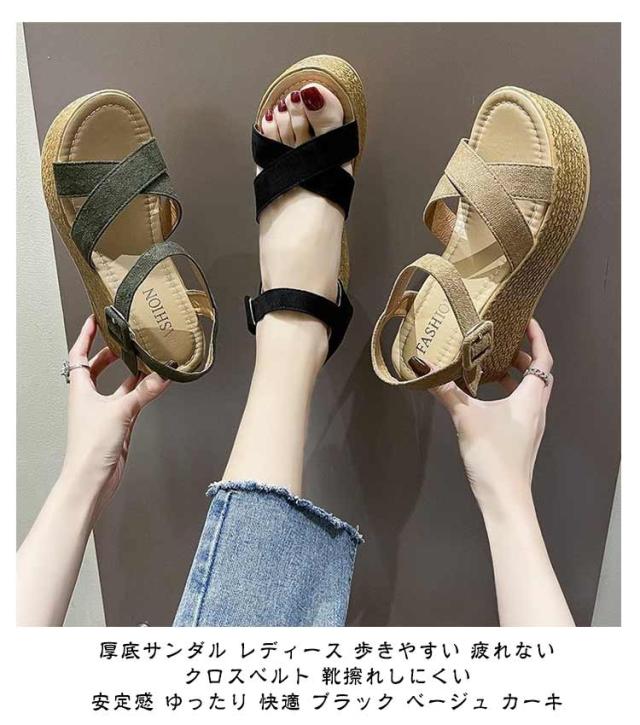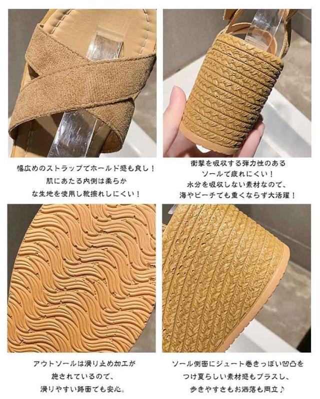 | 厚底サンダル レディース 歩きやすい 疲れない クロスベルト 靴擦れしにくい 安定感 ゆったり 快適 ブラック ベージュ カーキ 夏ファッションの必需品! 楽ちんお洒落が叶うサンダル! 衝撃を吸収する弾力性のあるソールで疲れにくい!水分を吸収しない素材なので、海やビーチでも重くならず大活躍! ソール側面にジュート巻きっぽい凹凸をつけ夏らしい素材感もプラスし、歩きやすさもお洒落も両立♪ ふんわり柔らかなインソールで疲れにくく、安定感のあるウェッジソールで歩きやすい♪ 幅広めのストラップでホールド感も良し!肌にあたる内側は柔らかな生地を使用し靴擦れしにくい! アウトソールは滑り止め加工が施されているので、滑りやすい路面でも安心。 | |