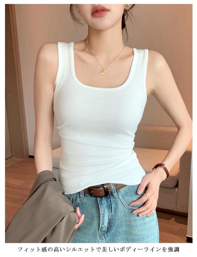タンクトップ タンクトップ 細身 レディース トップス ストレッチ 伸縮 ノースリーブ スクエアネック リブタンクトップ ブラチラ防止 脇肉カバー スクエアネックタンクトップ デコルテ見せ 袖なし 薄手 夏タンクトップ ブラック ホワイト グレー