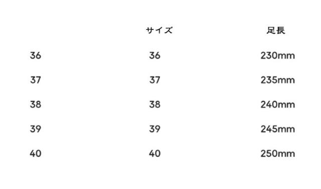 | サイズについての説明 | 36内寸23.0cm 37内寸23.5cm 38内寸24.0cm 39内寸24.5cm 40内寸25.0cm※サイズは平置き実寸になります。サイズ表の実寸法は商品によって1-3cm程度の誤差がある場合がございます |