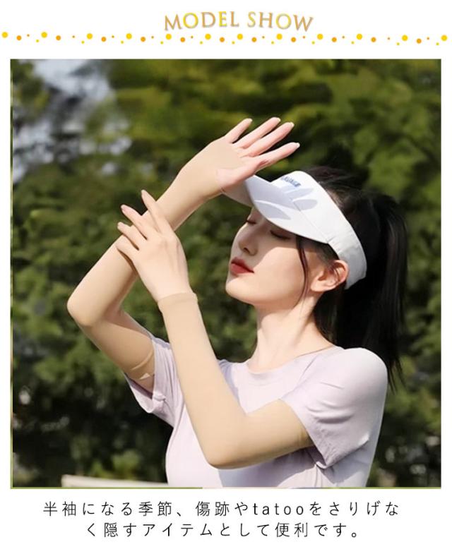 | ゴム部分は締め付け感も少なく、お肌になめらかにフィット! 接触冷感加工の他にも、抗菌防臭や吸汗加工、静電気防止加工など機能性も抜群! ファンデーションのような効果で、素肌より美しい見た目を演出。 丸めればポケットに入れて持ち運びもできるコンパクトなサイズ感。 UV対策の他にも傷や毛穴なども隠すことができます◎ 半袖になる季節、傷跡やtatooをさりげなく隠すアイテムとして便利です。 | |