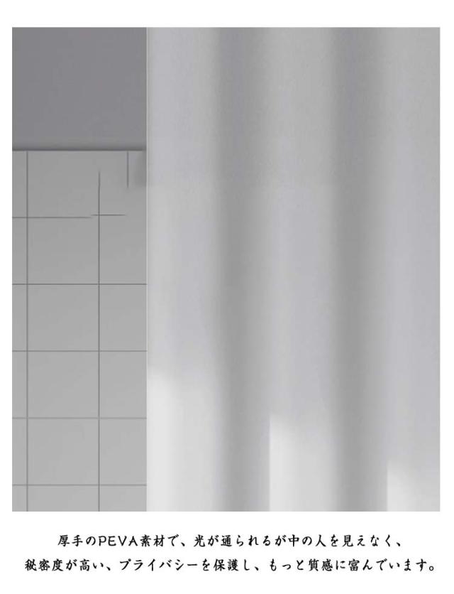 | 【採光性よく、透けない・遮像シャワーカーテン】 【全11サイズ】 厚手のPEVA素材で、光が通られるが中の人を見えなく、秘密度が高い、プライバシーを保護し、もっと質感に富んでいます。 防水性・防カビに優れ、熱や冷気を通しにくい。浴室のシャワーカーテンとしてはもちろん、ちょっとした目かくしや、暖房、冷房の効率アップにも。 透けないからシャワーする時がとても安心。収納スベースや、脱衣所等の空間は来客などの目に触れません、目隠しかーてんにもぴったり。 浴室カーテンを使用し、床に水が飛び散らないようにするとともに、バスルームの湿気を外に逃がさない保温効果があります。暑い夏でも寒い冬でもバスタイムを楽しめます。 上部合金製ハトメ加工、錆びにくく、長く綺麗にお使いただけます。 カーテンリング付属しているので、カーテンポールに引っ掛けるだけで取付できます。(カーテンポールは付属しません。) インテリアにあわせやすいおしゃれな無地デザイン、収納スベースや、脱衣所等の空間は来客などの目に触れません、目隠しかーてんにぴったり。 | |